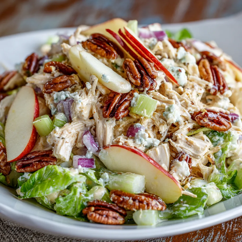 A refreshing and nutritious salad combining tender chicken, crisp apples, and crunchy pecans, perfect for a light meal or a side dish.