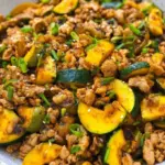 A quick and flavorful Asian-inspired stir fry featuring ground chicken, zucchini, and yellow squash, enhanced with white miso and coconut aminos.