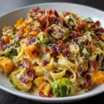 Imagine a plate of creamy pasta, each strand lovingly enveloped in a rich, velvety sauce that glistens under the warm kitchen light. The crispy beef bacon adds a delightful crunch, while tender Brussels sprouts and sweet butternut squash create a beautiful contrast in both texture and flavor. As you take your first bite, the smoky notes of the bacon dance with the sweetness of the squash, and the earthy Brussels sprouts provide a grounding balance. It’s a dish that not only satisfies your hunger but also ignites your senses!