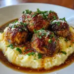 - Serve: Plate the meatballs over the buttery mashed potatoes, generously drizzled with brown gravy.