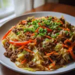 Each ingredient plays a starring role. The ground beef brings hearty protein, while the cabbage provides crunch and nutrients. Bell peppers add a sweet, vibrant pop of flavor, and carrots contribute both sweetness and color. Cooking with garlic and ginger doesn’t just flavor the oil; it perfumes the entire kitchen, leaving an enticing aroma in the air. Feel free to substitute the beef with ground turkey or tofu for a lighter, plant-based option; the result will still be mouth-watering.