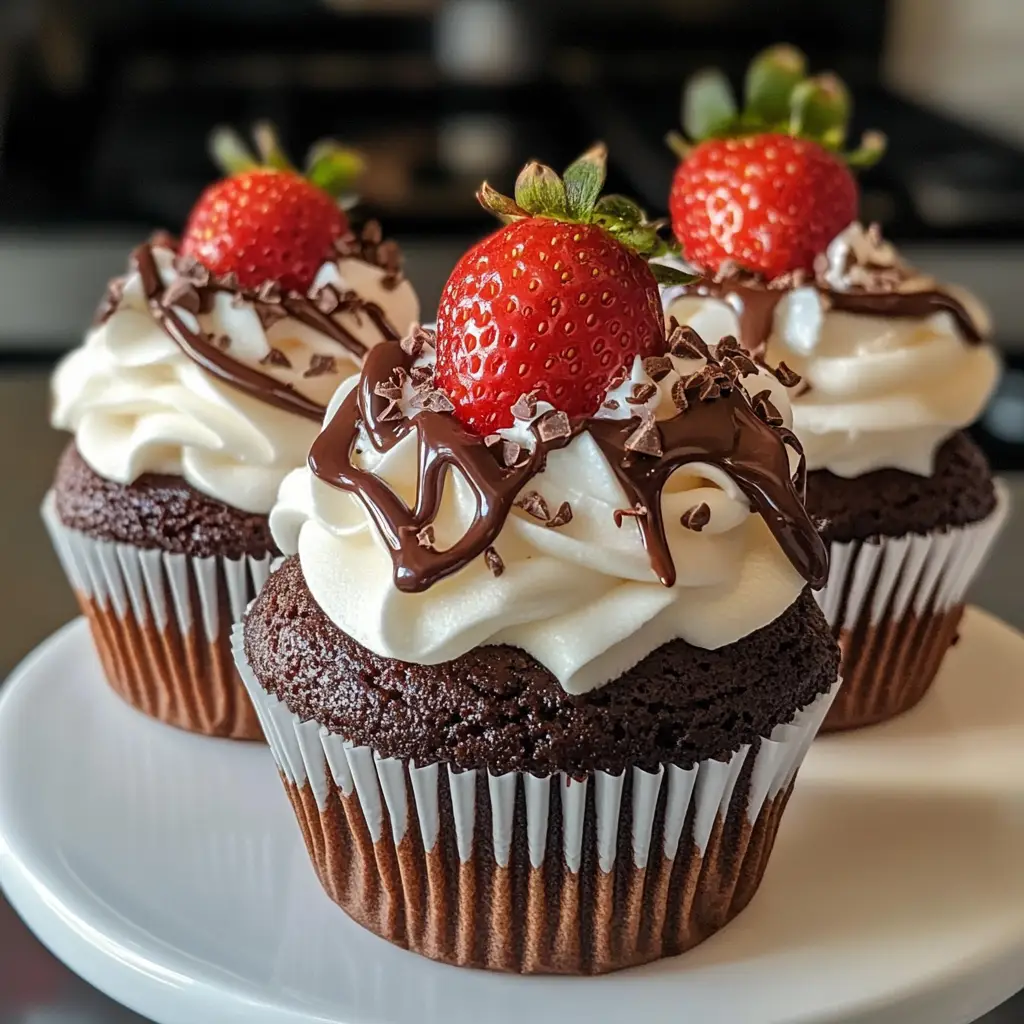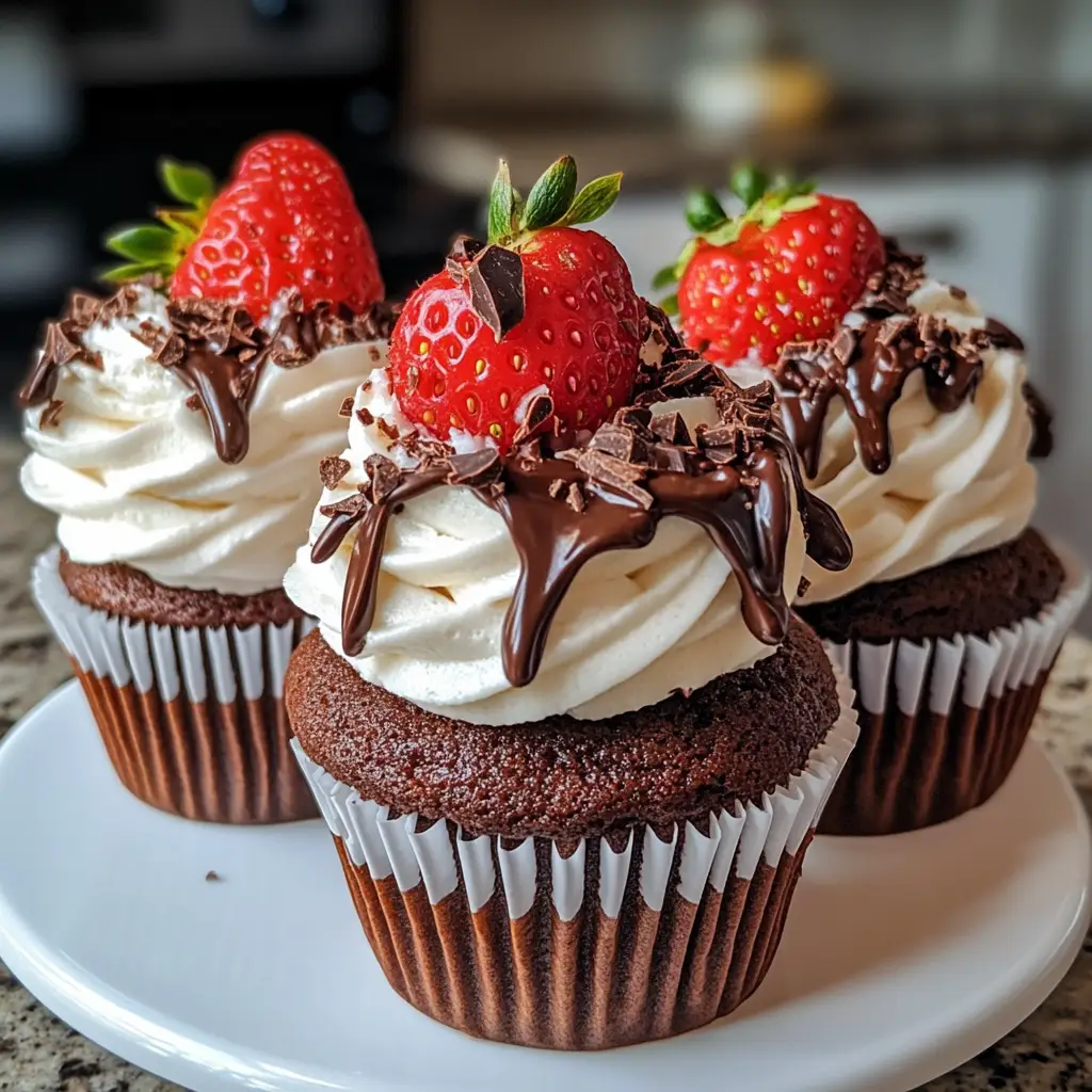 Delicious chocolate cupcakes topped with fresh strawberries and a rich chocolate ganache.