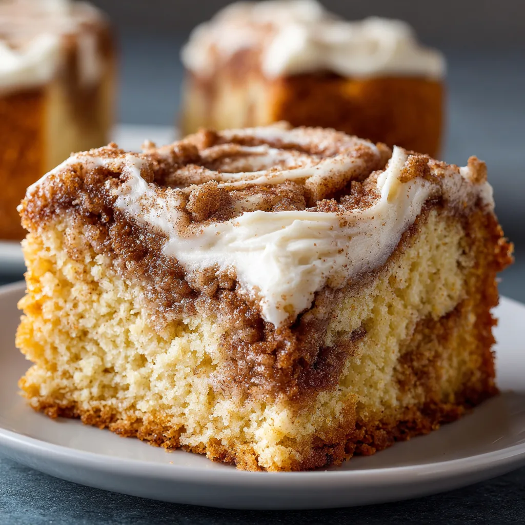 A deliciously moist coffee cake swirled with cinnamon and topped with a creamy frosting, perfect for breakfast or dessert.
