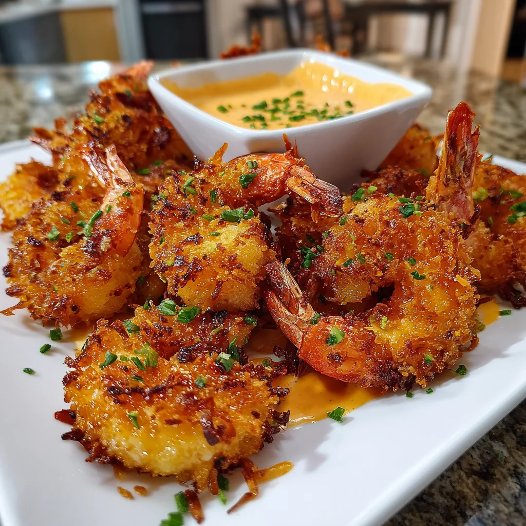 Coconut Shrimp with Sweet Chili Mayo is a delicious appetizer featuring crispy shrimp coated in coconut flakes, served with a sweet and spicy dipping sauce.