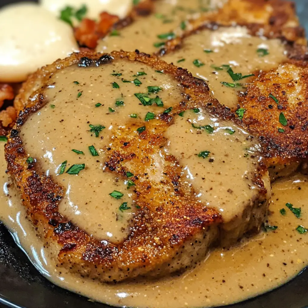 Few dishes capture the heart and soul of Southern comfort food quite like Country Fried Pork Chops with Bacon Gravy. This beloved recipe brings together perfectly crispy, golden fried pork chops coated in a seasoned flour batter, paired with a rich, smoky bacon gravy that elevates the dish to pure indulgence. The marriage of crunchy exterior and tender, juicy pork inside, combined with the luscious, savory gravy, creates a meal that feels like a warm hug on a plate. Whether served at a family gathering, Sunday dinner, or a cozy weekday meal, this recipe has stood the test of time as a crowd-pleaser across generations. It’s hearty, filling, and made with simple ingredients that come together beautifully for maximum flavor. For lovers of Southern cuisine or anyone craving a soul-warming classic, this recipe delivers comfort and satisfaction in every bite.