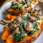 Tender sweet potatoes stuffed with a creamy mushroom and spinach filling, offering a comforting and nutritious meal.