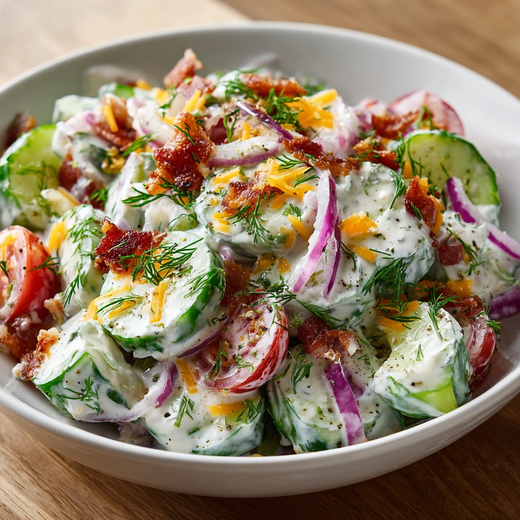 Health Benefits: Cucumbers are hydrating and low in calories, while fresh dill is rich in antioxidants. The addition of bacon and cheese provides protein and flavor, making this salad a balanced side dish.