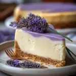A luscious Honey Lavender Cheesecake featuring a rich cream cheese filling and a sweet graham cracker crust, infused with floral notes of lavender and honey.