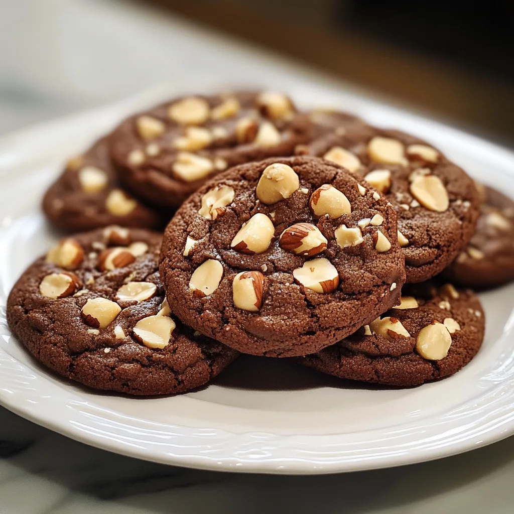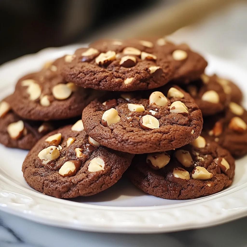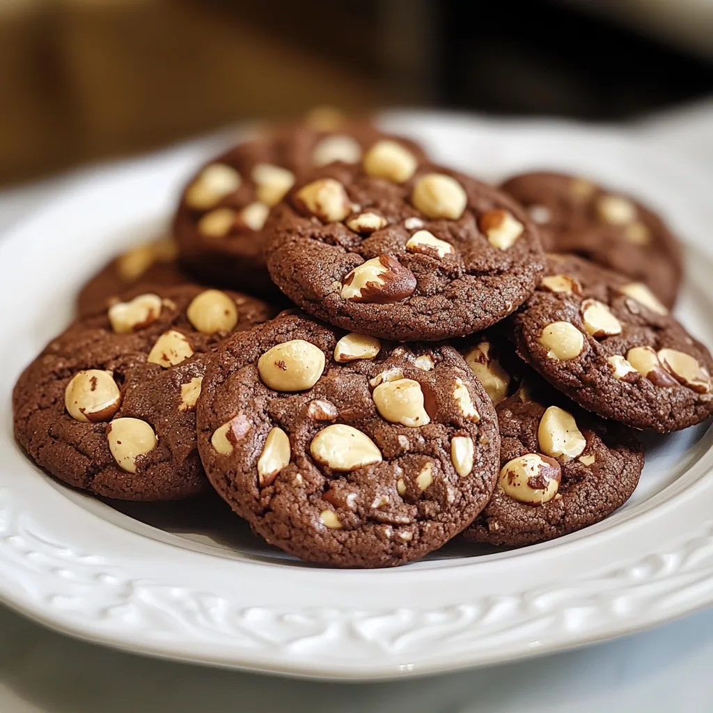 Deliciously rich double chocolate cookies with crunchy hazelnuts, perfect for chocolate lovers.