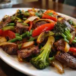 - Add Vegetables: Now, it’s time to add the vibrant colors! Toss in the sliced red and green bell peppers, sliced onion, and 2 cups of broccoli florets. Stir-fry for an additional 5-7 minutes until the vegetables are tender-crisp. The combination of sizzling beef and fresh veggies creates an irresistible aroma that will have everyone gathering around.