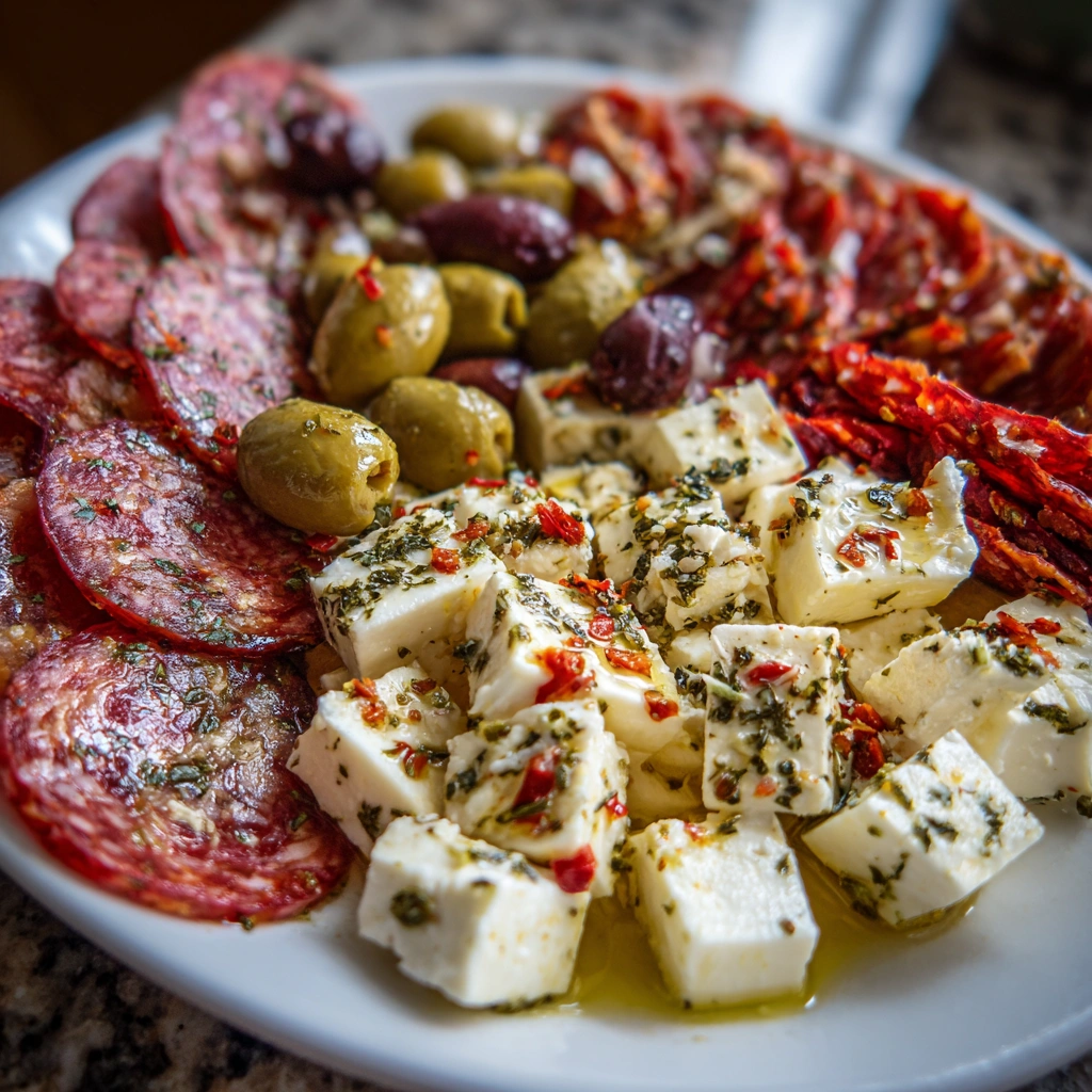 Keywords: Easy Marinated Cheese Appetizer, Salami, Green Olives, Mediterranean Appetizer, Cheese Platter, No-Cook Appetizer, Party Food, Quick Appetizer, Savory Cheese Recipe, Marinated Cheese, Appetizer Recipes, Gluten-Free Appetizer, Easy Entertaining