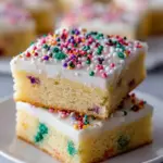 Deliciously soft and chewy sugar cookie bars topped with creamy frosting and colorful sprinkles.