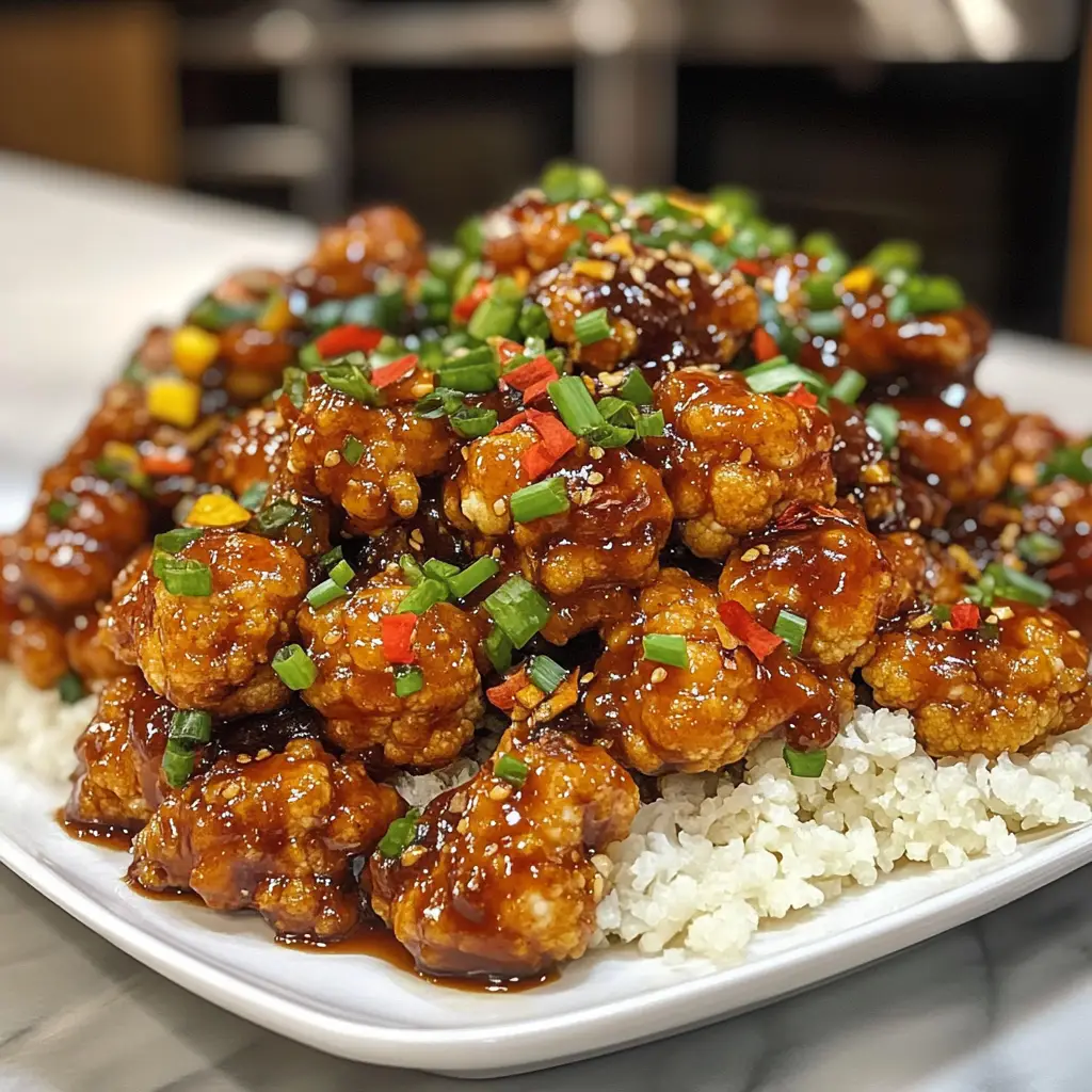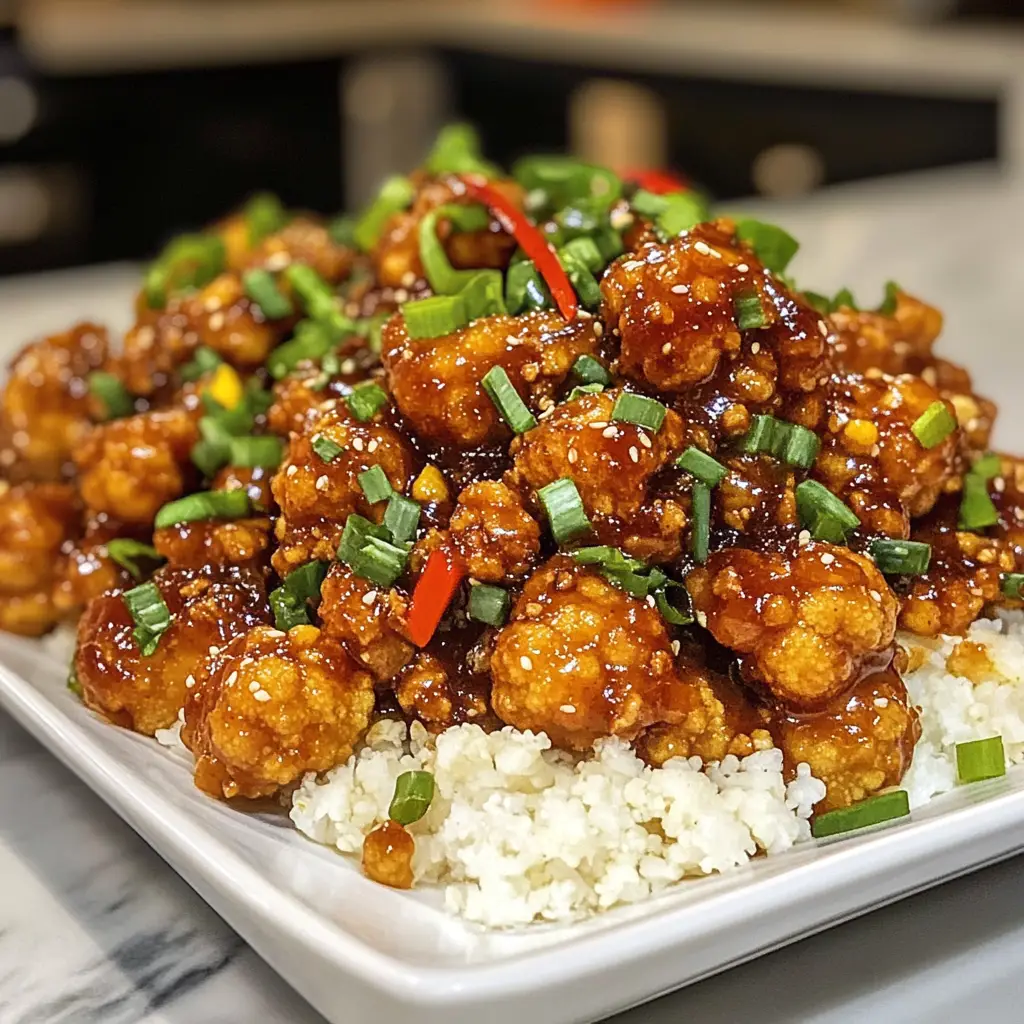 A healthy twist on the classic General Tso’s dish, featuring crispy cauliflower tossed in a flavorful sauce, served in a bowl.
