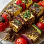 Deliciously marinated za’atar tofu skewers grilled to perfection, paired with vibrant vegetables for a healthy and flavorful meal.