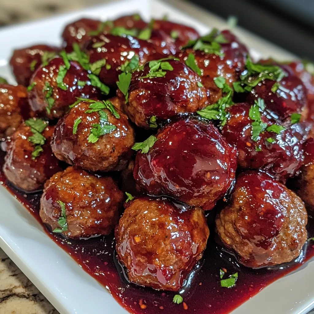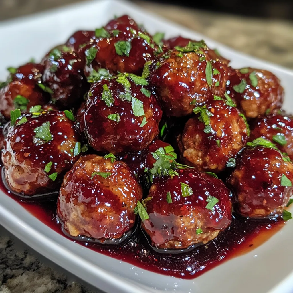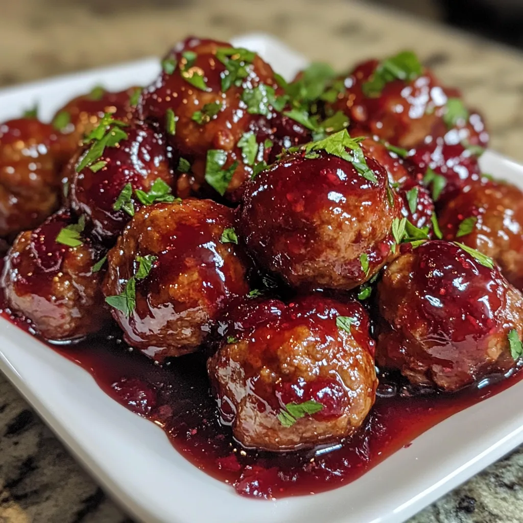 Delicious turkey meatballs glazed with a sweet and tangy cranberry sauce, perfect for a festive meal.