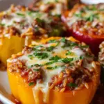 A comforting and flavorful meal featuring seasoned ground beef and vibrant bell peppers topped with melted cheese.