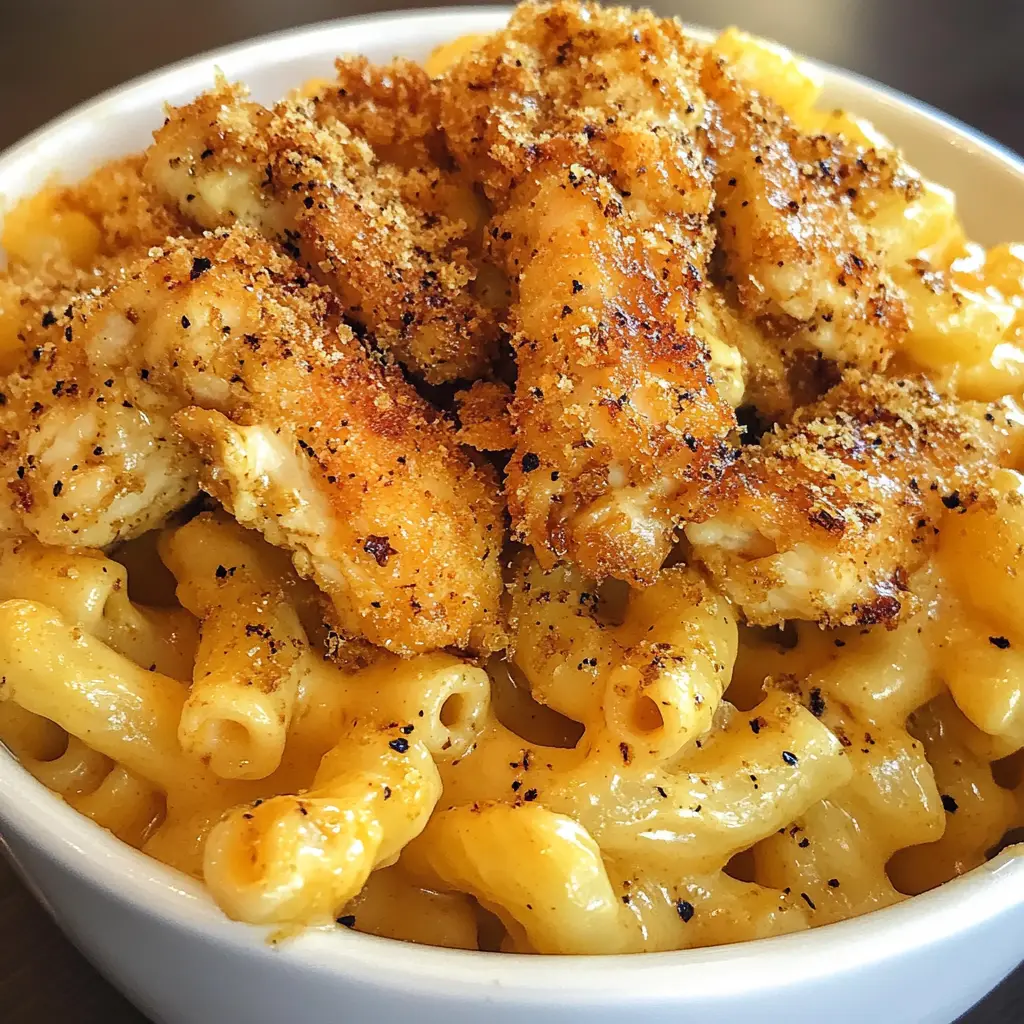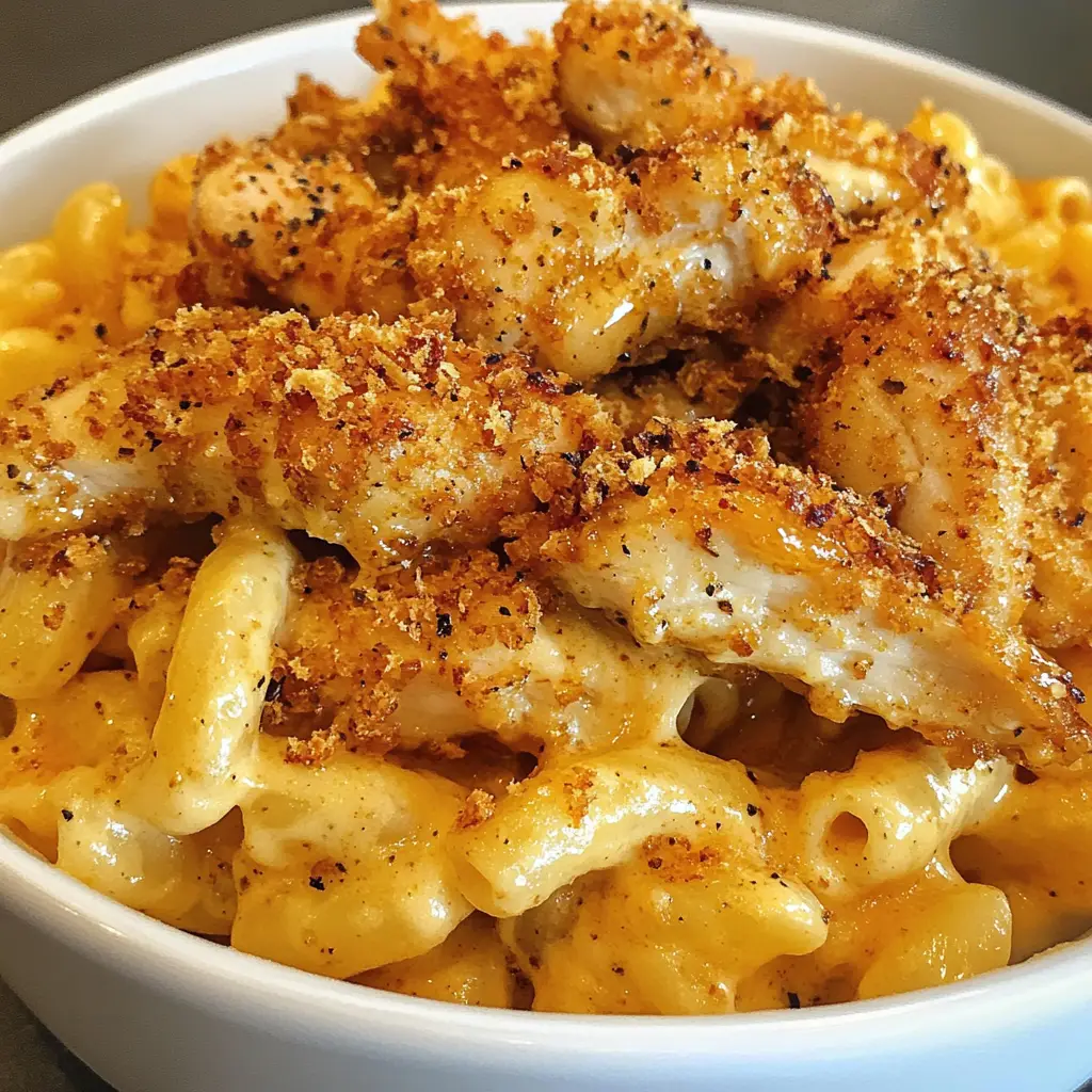 A creamy and flavorful dish combining honey pepper chicken with rich mac and cheese.