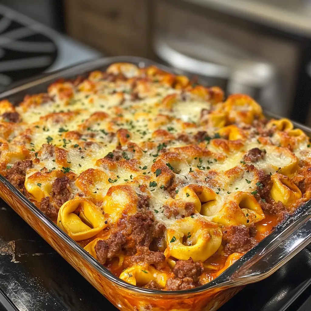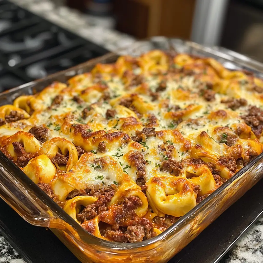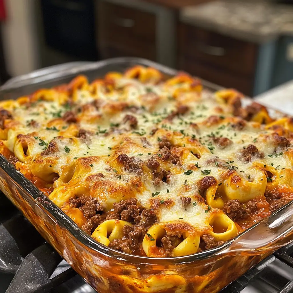 A comforting and hearty dish featuring tender tortellini baked with a savory beef sauce and topped with melted cheese, perfect for cozy nights.