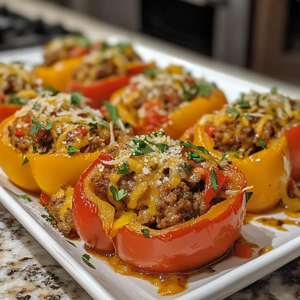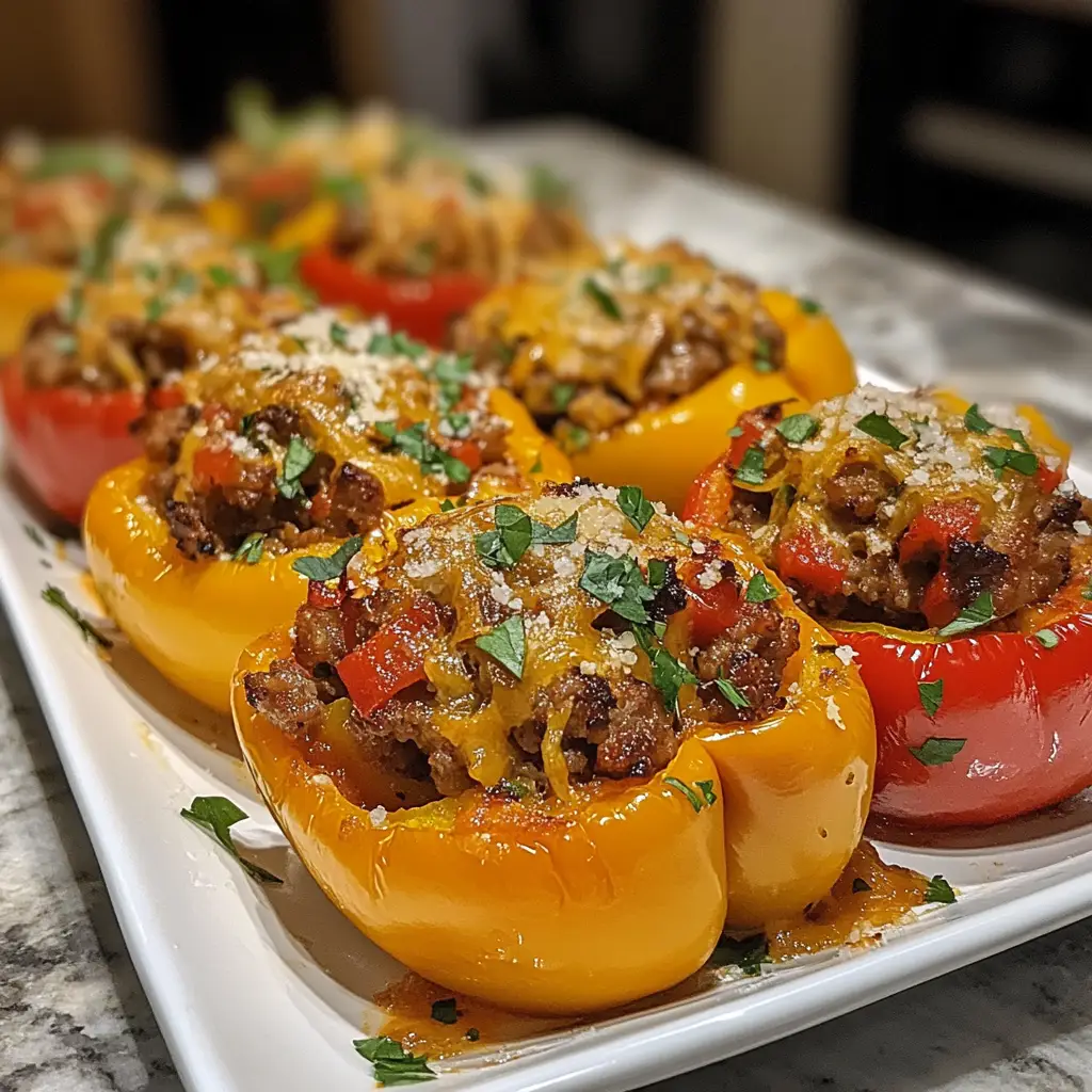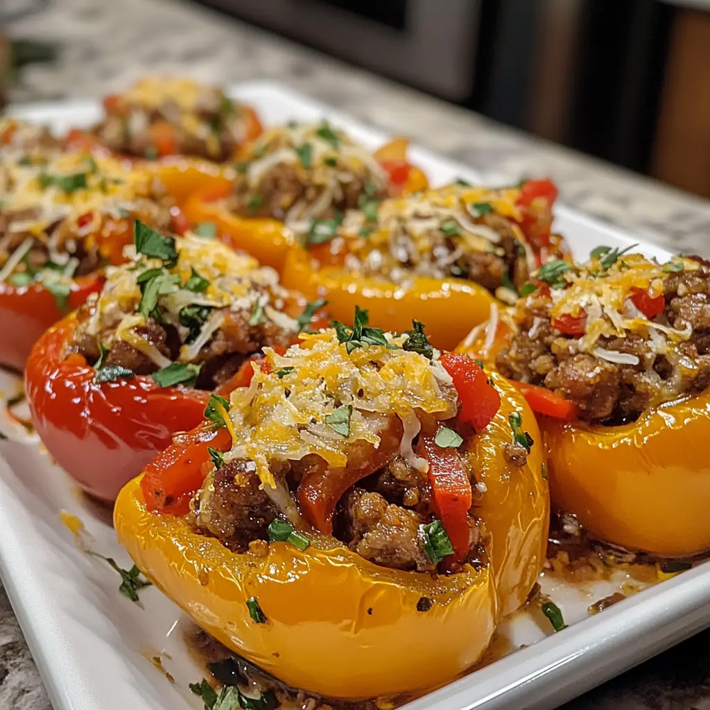 Italian Sausage Stuffed Peppers are a flavorful and satisfying dish made with bell peppers filled with a savory mixture of Italian sausage, rice, and spices.