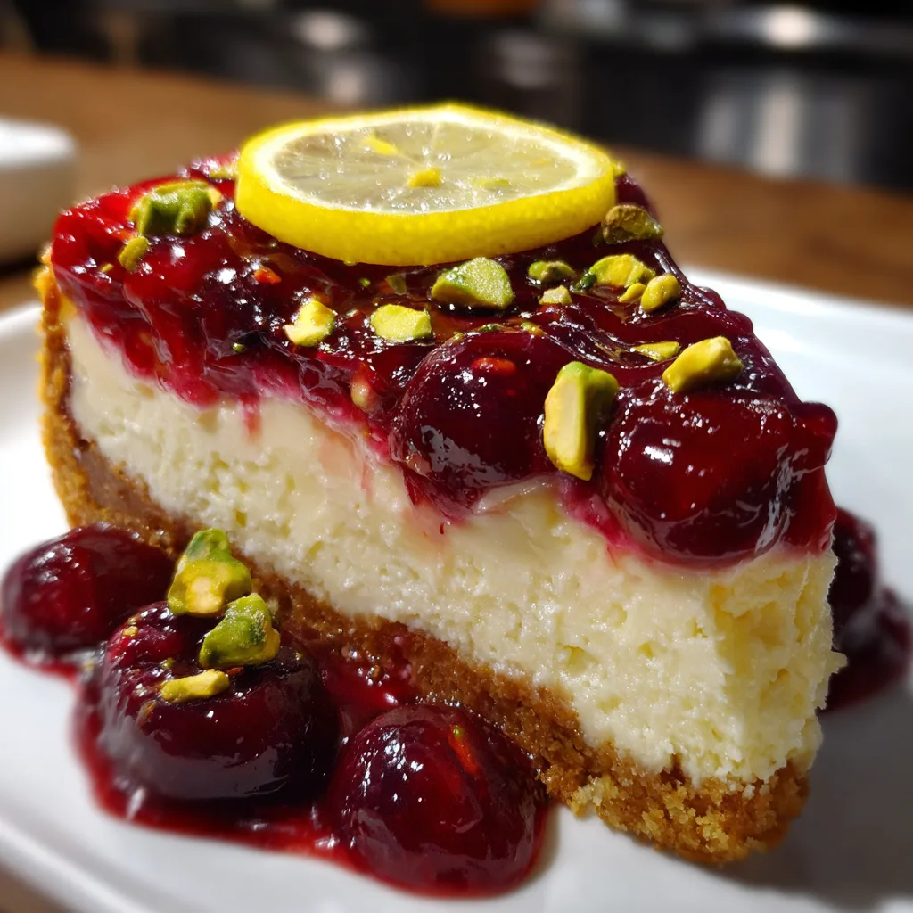 A delightful dessert that combines the zesty flavors of lemon and lime with the sweetness of cherries and the crunch of pistachios.