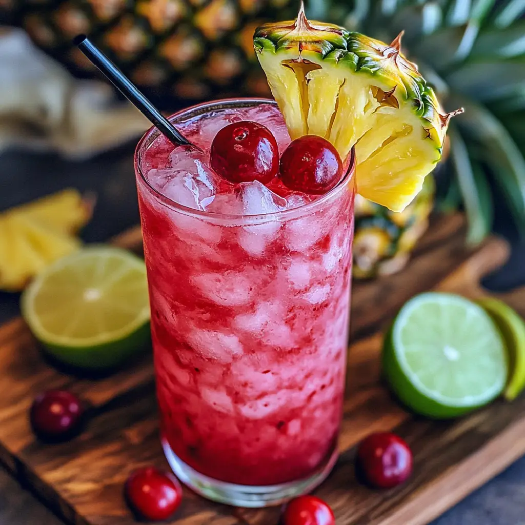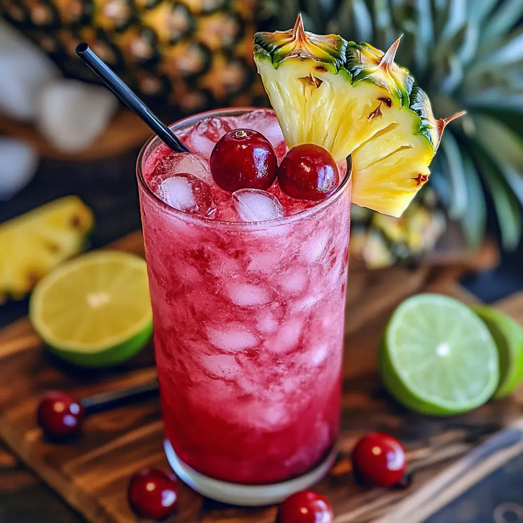 Garnish with a pineapple wedge, maraschino cherry, and optionally a sugared rim or coconut flakes for flair.