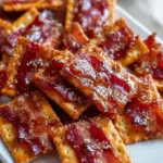 A sweet and savory appetizer featuring crispy bacon and buttery crackers glazed with maple syrup and brown sugar.
