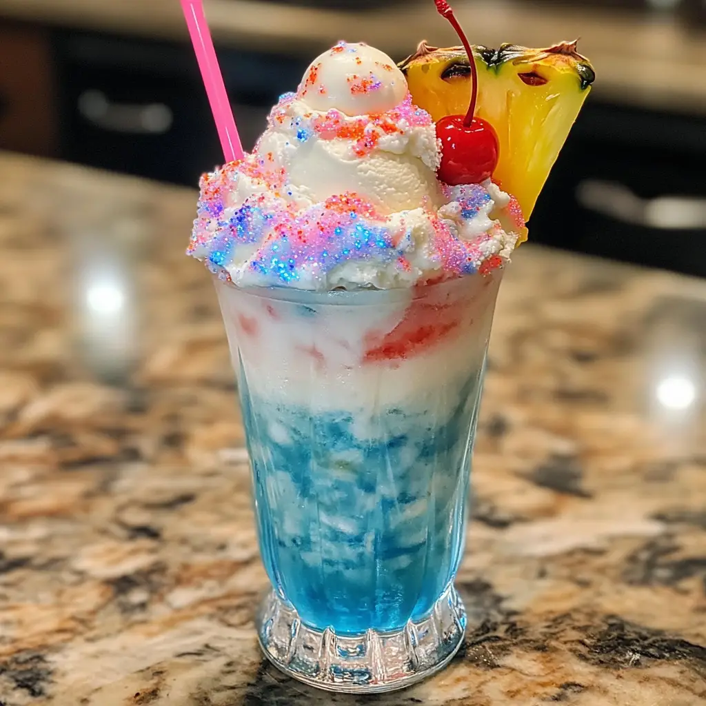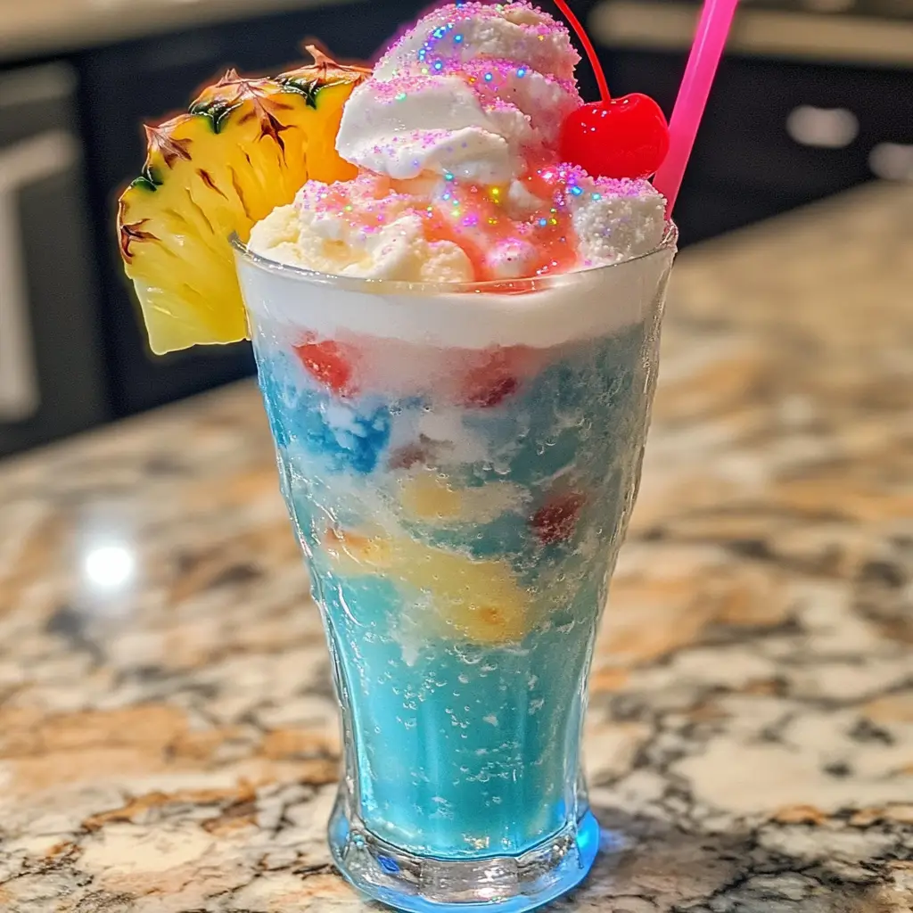 Step 6: Garnish with fantasy. Top each float with whipped cream, then decorate with edible pearl sprinkles, shimmer dust, or even cotton candy clouds. A maraschino cherry or pineapple wedge perched on top makes it extra festive.