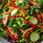 Each bite delivers a contrast of textures—crunchy carrots, velvety cucumber, and the sweet, subtle bite of red bell pepper mingle beautifully together. With every forkful, the earthy notes of sesame oil and the zesty snap of ginger awaken your senses, inviting you to return for more. This salad isn’t just a side; it’s an experience—a celebration of seasonal greens infused with an umami-rich dressing that’s like a warm hug on your plate.