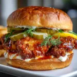 Imagine biting into a Nashville Hot Chicken Sandwich, where the crispy, golden-brown chicken thigh crackles under your teeth, releasing a wave of spicy warmth that dances on your palate. The heat is perfectly tempered by a cool, creamy dill sauce that envelops your taste buds in a refreshing embrace. This dish is not just a meal; it’s an experience that evokes memories of summer barbecues and family gatherings, where laughter fills the air and the aroma of fried chicken wafts through the kitchen. Whether you’re hosting a backyard party or enjoying a cozy night in, this sandwich is the perfect centerpiece that brings people together, igniting joy and satisfaction with every bite.