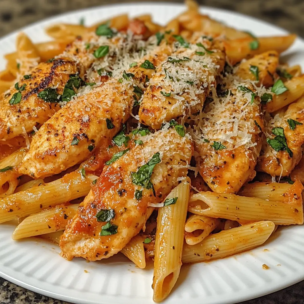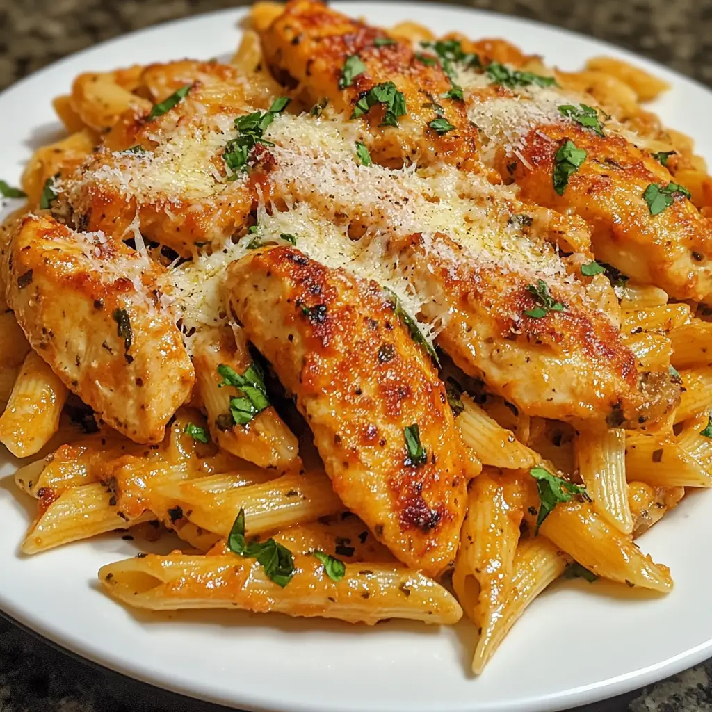 A simple and delicious one-pot meal that combines chicken, pasta, and Parmesan cheese for a quick dinner solution.