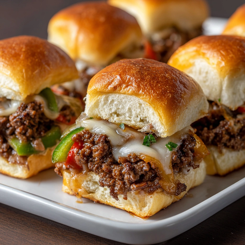 Keywords: Philly Cheesesteak Sliders, Ground Beef Sliders, Cheesesteak Recipe, Easy Appetizers, Party Food, Comfort Food, Quick Dinner, American Cuisine, Slider Recipes, Beef Sliders, Melted Cheese, Game Day Snacks