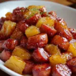 - Pour the sauce over the sausages and pineapple, coating them evenly.