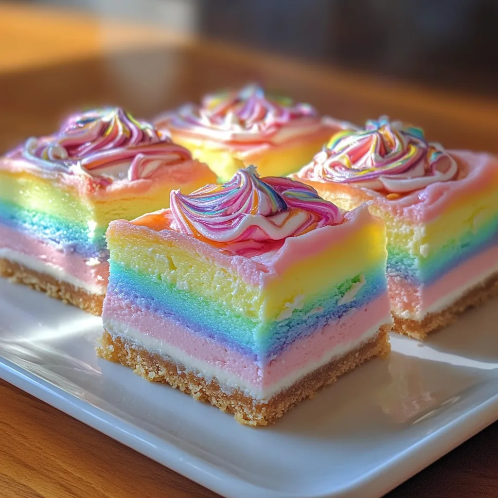 Creating these Rainbow Layered Cheesecake Bars is more than just baking; it’s about bringing joy to your kitchen and your loved ones. Each colorful layer tells a story, making every bite a delightful experience. Whether it’s a family gathering or a simple weeknight treat, these bars are sure to spark smiles and laughter. Plus, the ease of preparation means you can focus on what truly matters—making memories. So, roll up your sleeves, unleash your inner artist, and enjoy the sweet satisfaction of sharing this vibrant dessert with those you cherish. Happy baking!