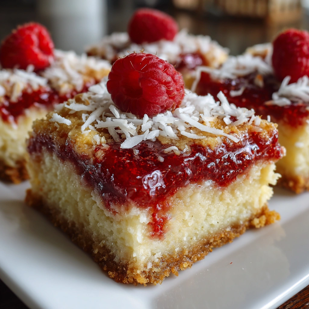 Keywords: Raspberry Coconut Bars, Almond Crust, Gluten-Free Dessert, Easy Dessert Recipe, Tropical Bars, Healthy Snack, Vegan Dessert, No-Bake Option, Summer Treat, Berry Dessert, Coconut Topping, Homemade Bars