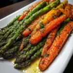 Imagine pulling a baking sheet from the oven, revealing a stunning array of golden-brown asparagus and vibrant orange carrots, glistening with a light sheen of olive oil and sprinkled with fragrant herbs. The moment you catch a whiff of their earthy aroma, your mouth begins to water in anticipation. Each piece is perfectly roasted, with the asparagus offering a tender crunch while the carrots boast a sweet, caramelized finish that dances on your palate.