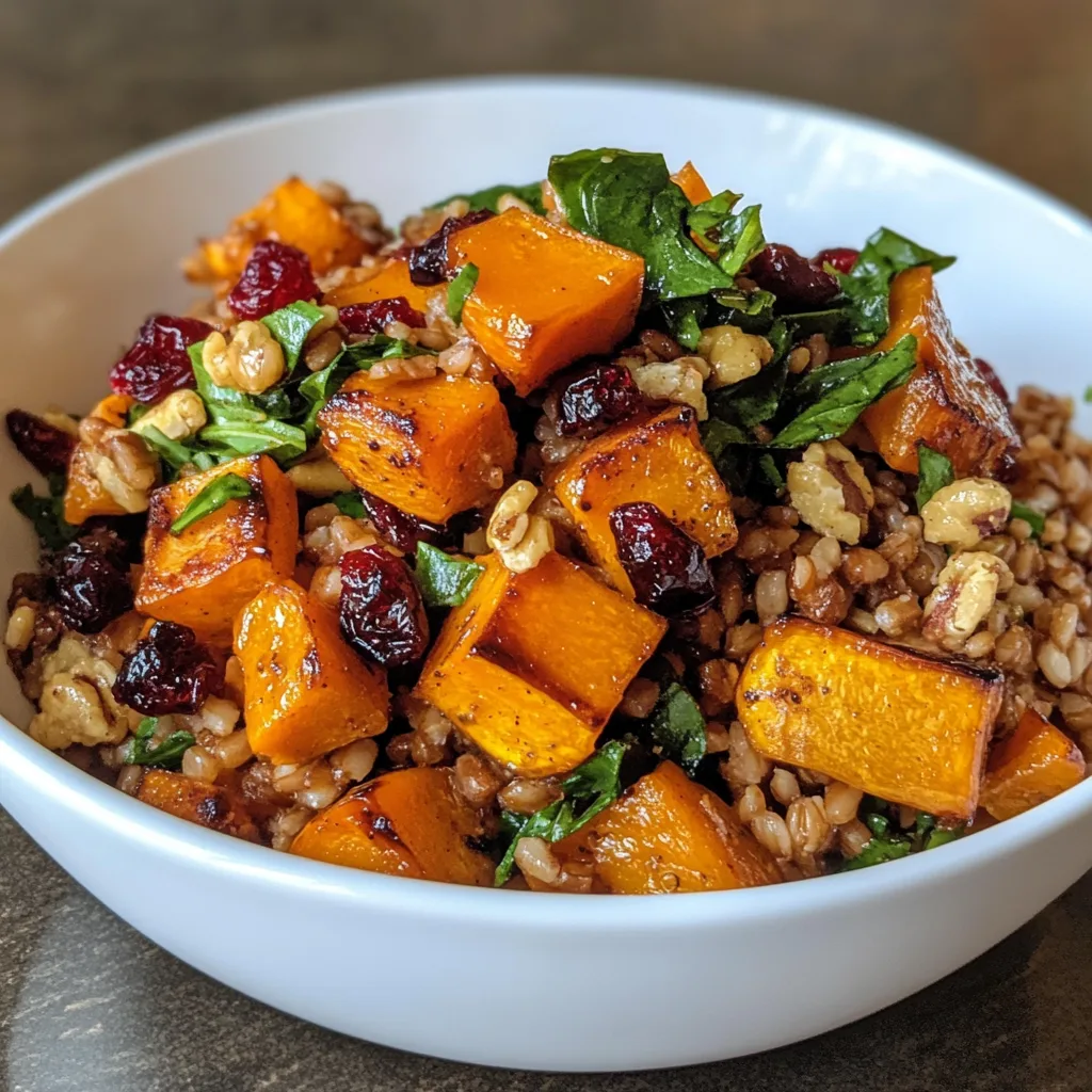 A delicious and nutritious bowl featuring roasted butternut squash and farro, perfect for a healthy meal.