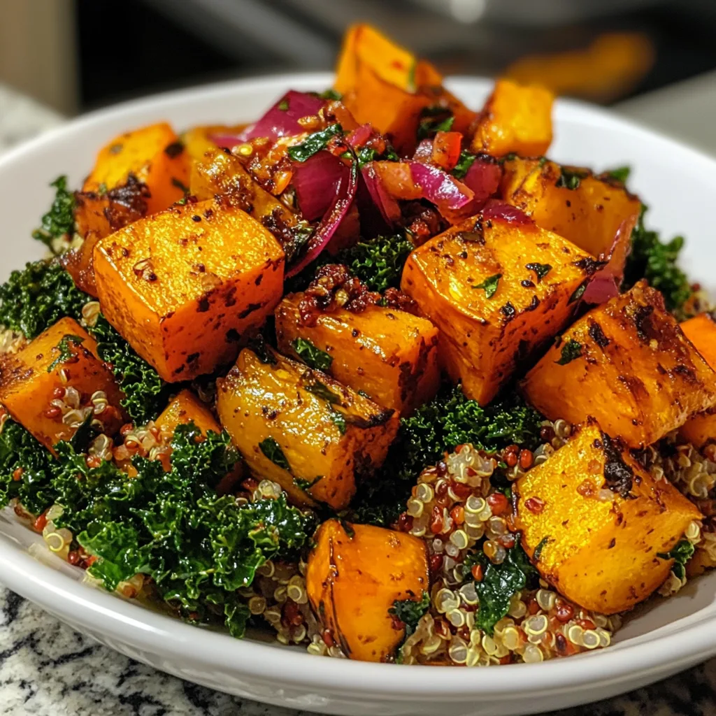 A delicious and nutritious bowl featuring roasted pumpkin, kale, and quinoa, perfect for a healthy meal.