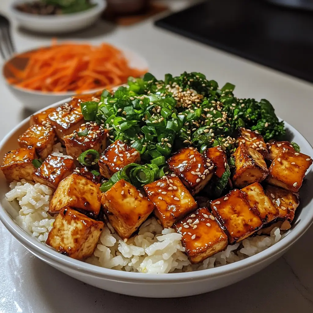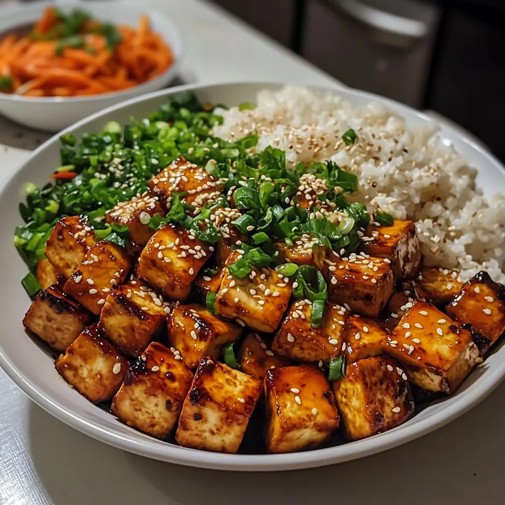 - Serve the crispy tofu over rice or quinoa, topped with sautéed vegetables, green onions, and sesame seeds.