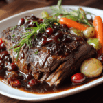 Keywords: Slow-Braised Beef Roast, Cranberry Balsamic Glaze, Tender Beef, Comfort Food, Holiday Dinner, Braised Meat, Savory Roast, Easy Dinner Recipe, American Cuisine, Beef Roast Recipe, Family Meal, Festive Dish, Gluten-Free Recipe, Hearty Main Course