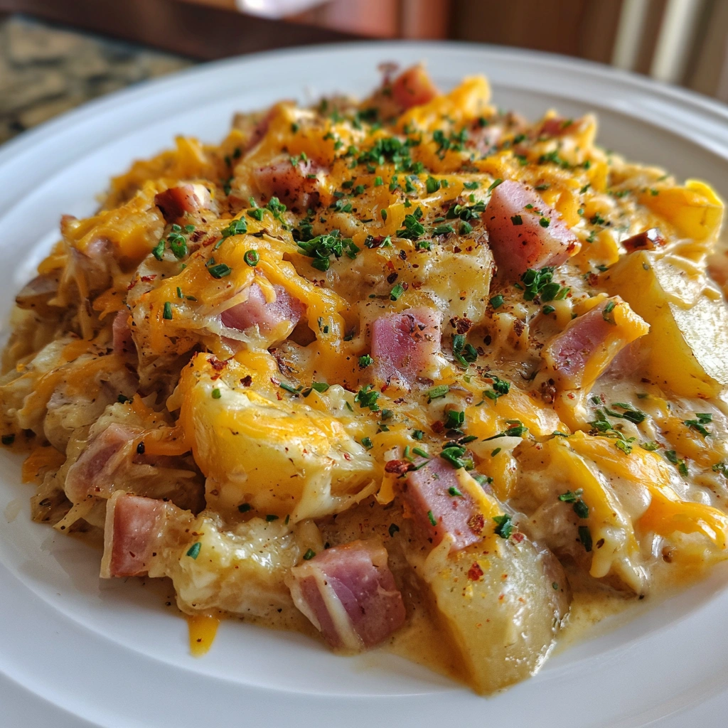Keywords: Slow Cooker Cheesy Ham & Potato Casserole, ham casserole, cheesy potato dish, comfort food, slow cooker recipes, easy dinner, creamy casserole, family meal, hearty dish, potato recipes, ham recipes, one-pot meal, American cuisine