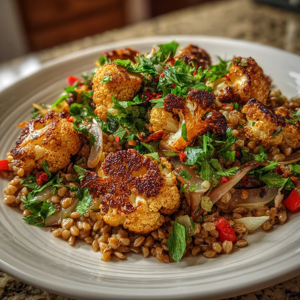 A flavorful and nutritious salad featuring spiced roasted cauliflower and farro, perfect for a healthy meal.