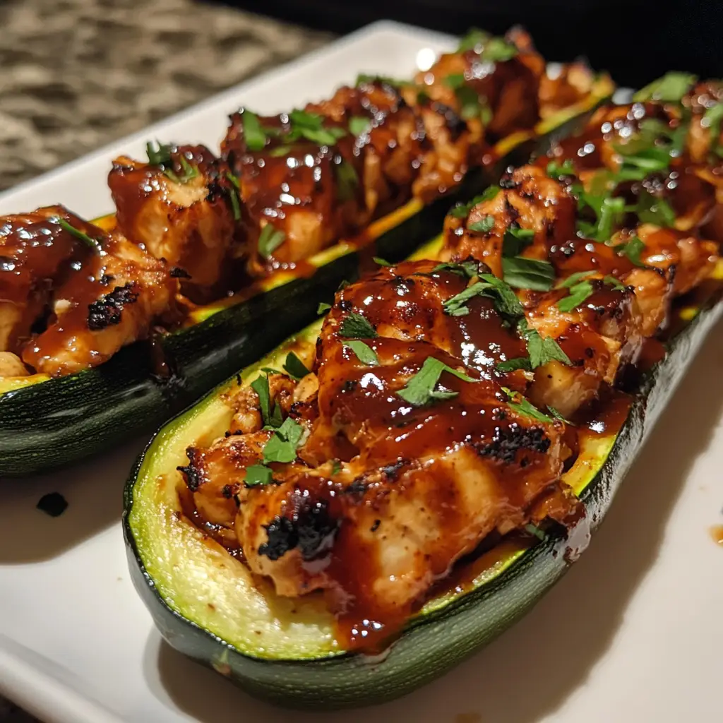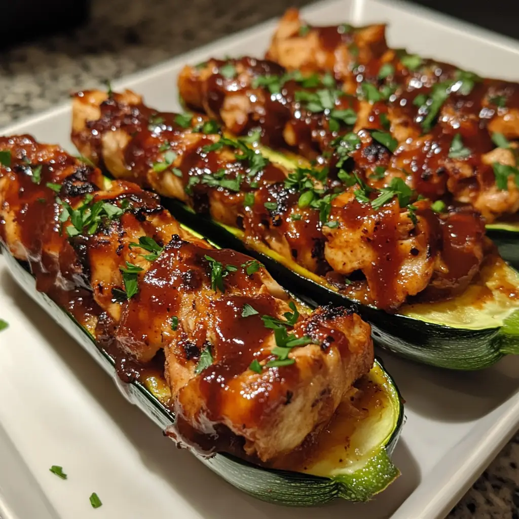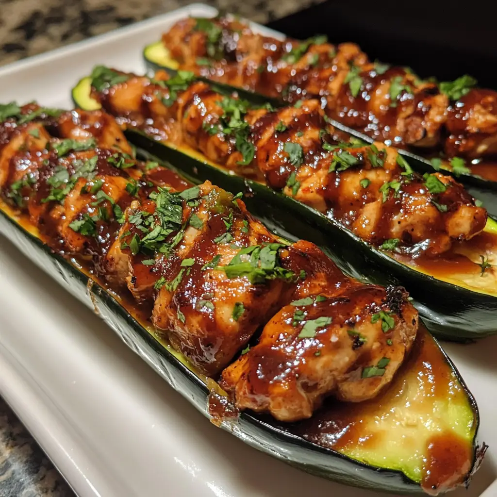 Delicious zucchini boats filled with sticky BBQ chicken, perfect for a tasty dinner.