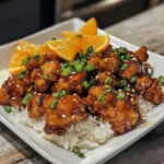 Now it’s time to serve! Spoon the sticky orange chicken over a bed of fluffy rice. Don’t forget to garnish with chopped green onions and a sprinkle of sesame seeds. This adds a lovely crunch and makes the dish look extra special. Enjoy every bite!