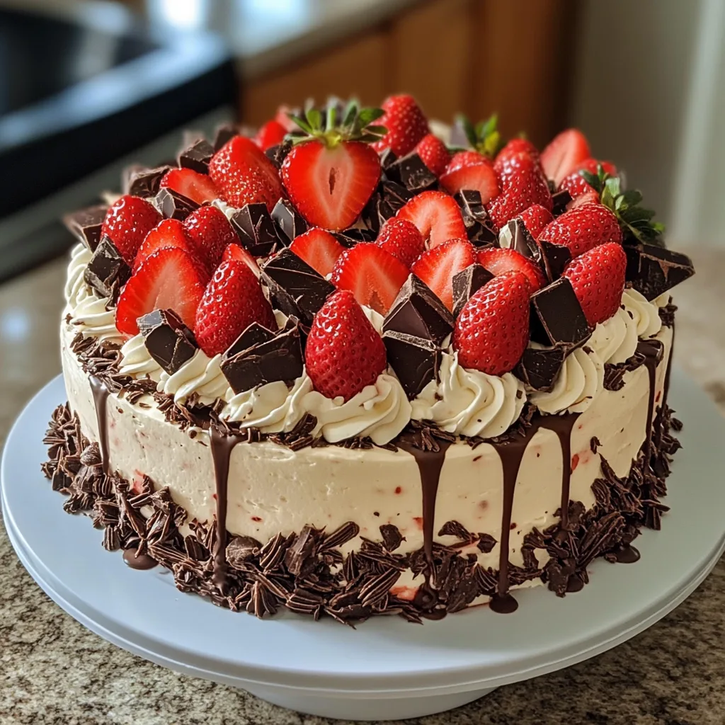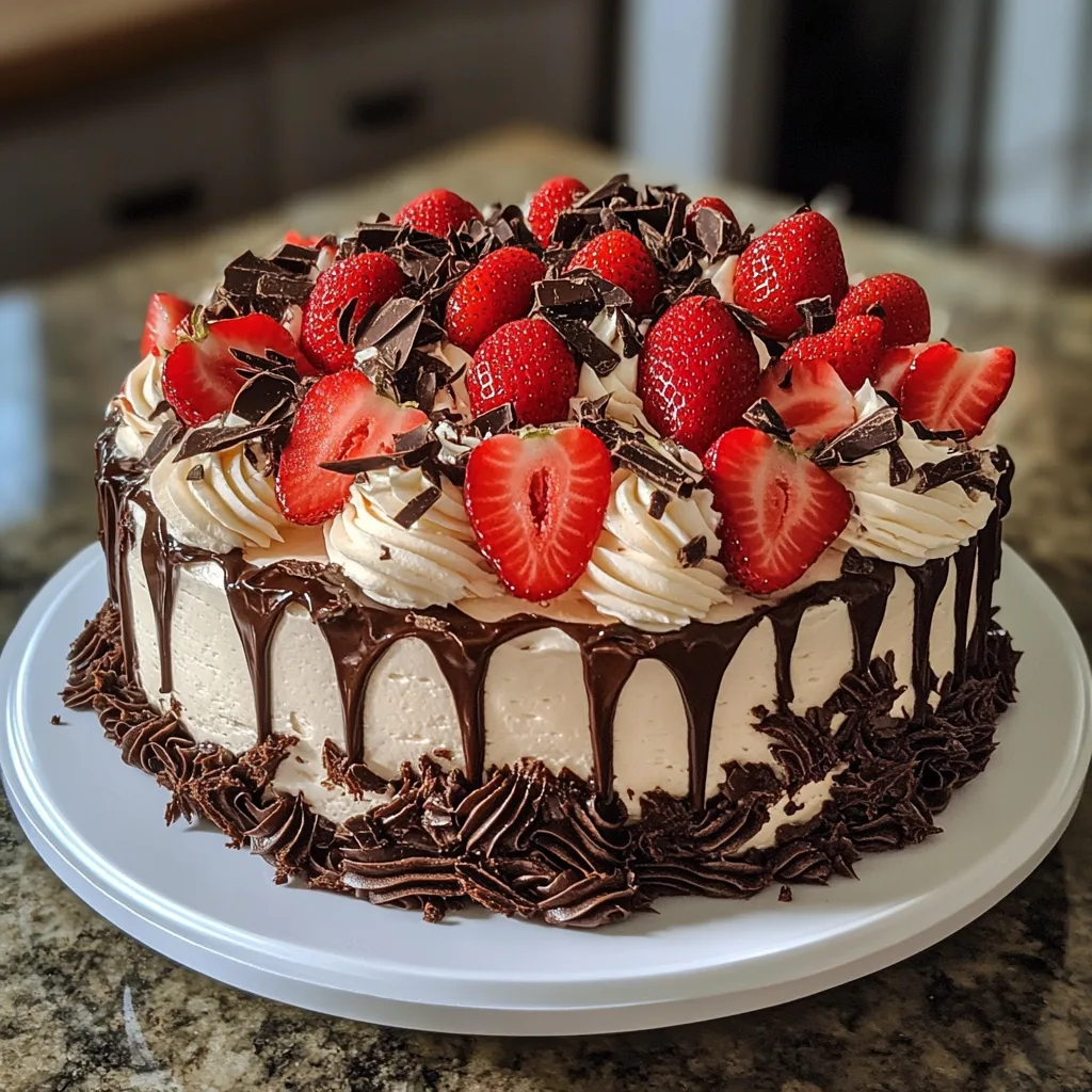 A decadent and delightful cake combining rich chocolate and fresh strawberries for a heavenly dessert experience.
