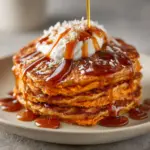 Delicious and fluffy sweet potato pancakes drizzled with maple syrup, perfect for breakfast or brunch.