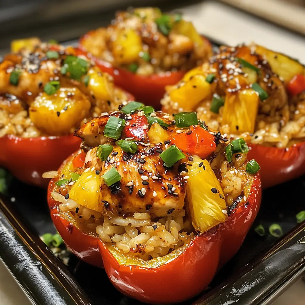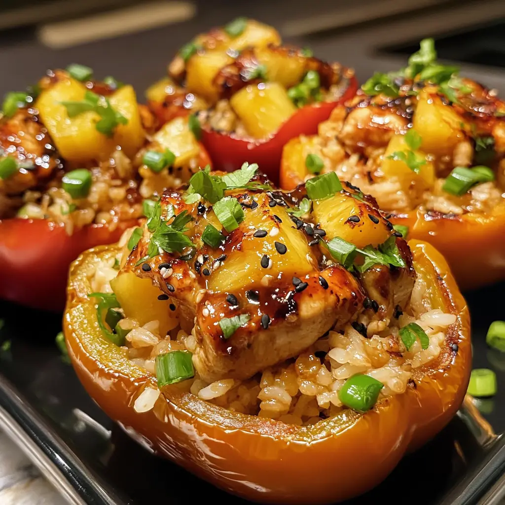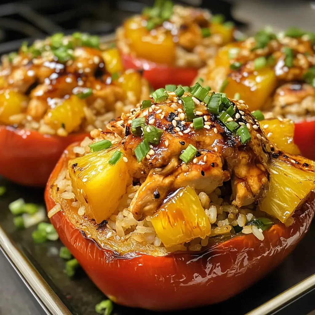 A delicious and colorful dish featuring bell peppers stuffed with a savory mixture of teriyaki chicken, pineapple, and rice.