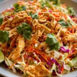 A vibrant and crunchy salad featuring shredded chicken, fresh cabbage, and a creamy peanut sauce, perfect for any occasion.