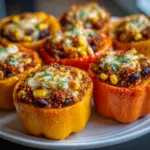Picture this: vibrant orange bell peppers, their glossy skin glistening under the kitchen lights, carved into playful jack-o’-lanterns, each one brimming with a colorful, savory filling that promises a delightful explosion of flavor. As you slice into the peppers, the sweet aroma wafts through the air, mingling with the earthy notes of cumin and the smoky essence of paprika. It’s a feast for the senses that beckons you to take a bite.