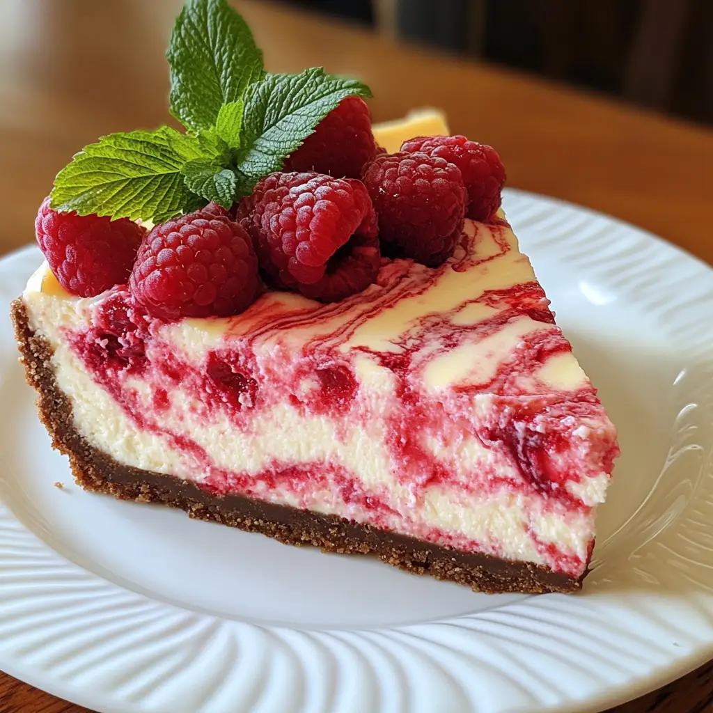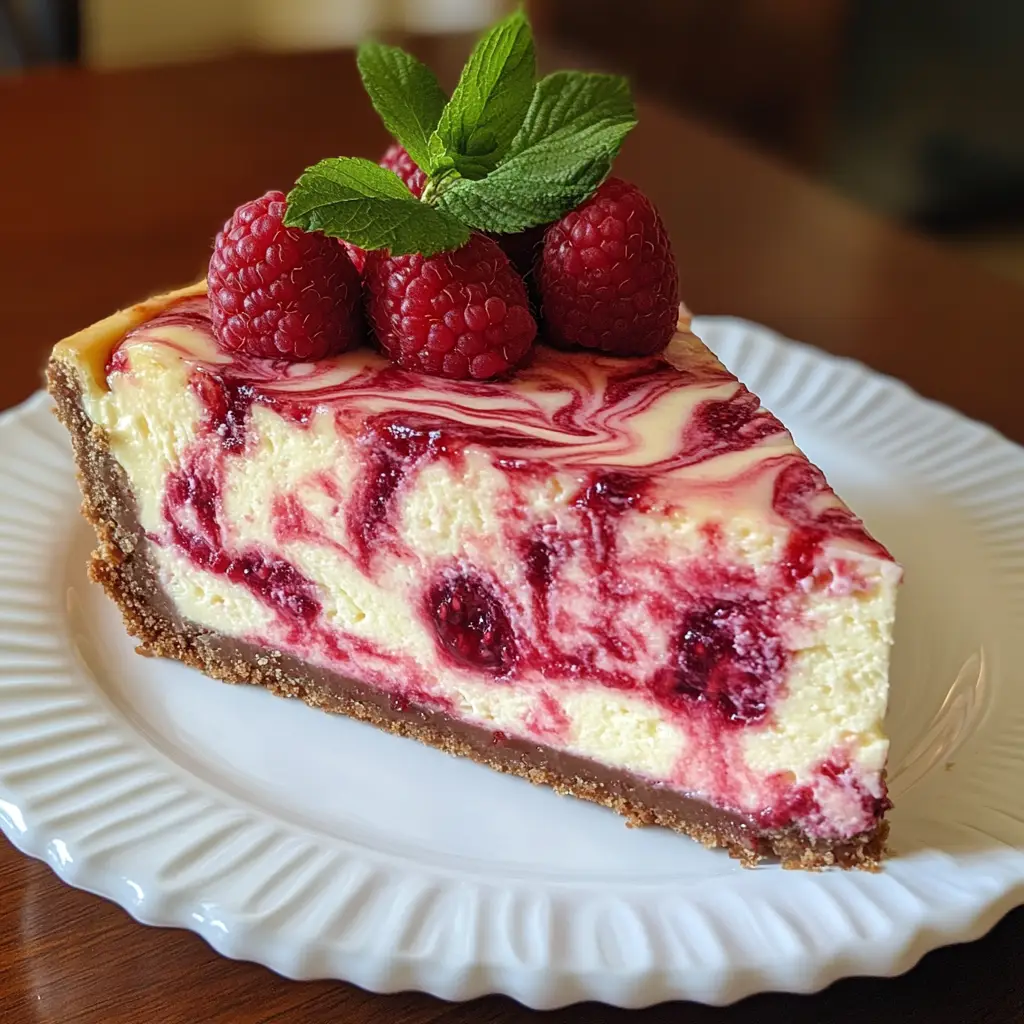 A deliciously creamy cheesecake with a delightful raspberry swirl and white chocolate, perfect for impressing guests.