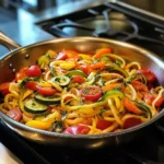While this dish is best enjoyed fresh, you can prep the vegetables in advance. Spiralize the zucchinis and chop the other veggies. Store them in the fridge until you’re ready to cook. Just remember, zoodles can get a bit soggy if stored too long, so try to enjoy them within a day or two!